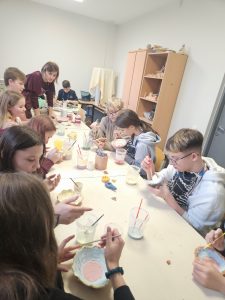 Spalio 27 dieną mūsų gimnazijos septintokai kartų su dailės mokytoja Luiza Volodko dalyvavo kūrybinės keramikos dirbtuvėse Pabradės „Žeimenos“ gimnazijoje, kuriose mokiniai glazūravo savo lėkštutes ir kartu lipdė pelėdas – draugystės ir išminties simbolį. Bendras kūrybinis laikas virto gražia bendrystės patirtimi.